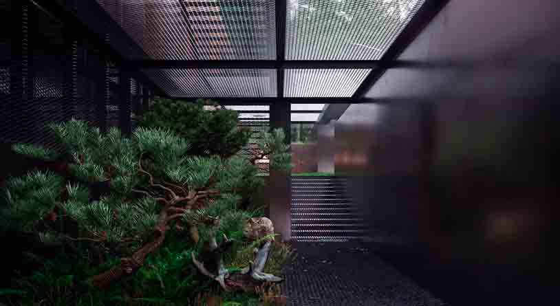- Перфорированная сетка гармонично отбрасывает глубокие тени и идеально сочетается с атмосферостойкой сталью кортен.