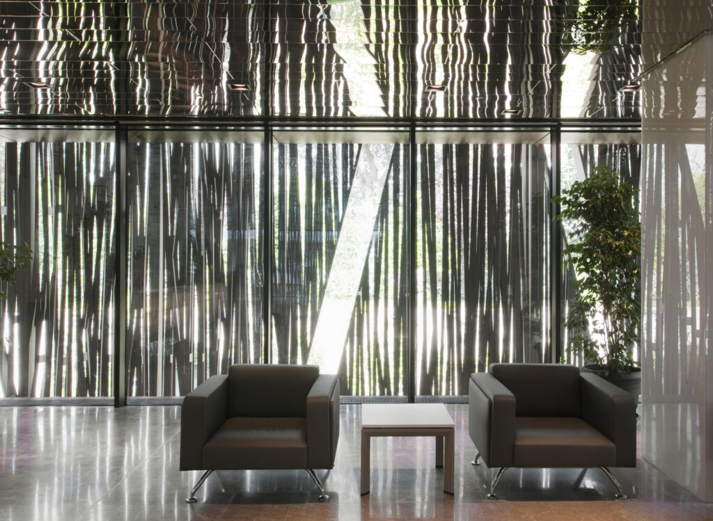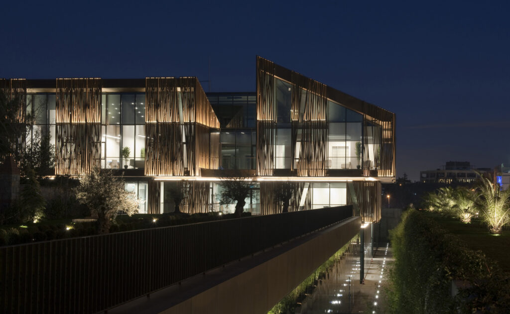 Чтобы обеспечить баланс света и тени и повысить эффективность пассивного климат-контроля, массы окутаны разработанной системой ячеек. Три этажа под офис и два подземных этажа отведены под парковку пятиэтажного здания. Над парковкой первый цокольный этаж находится на уровне затонувшего сада.