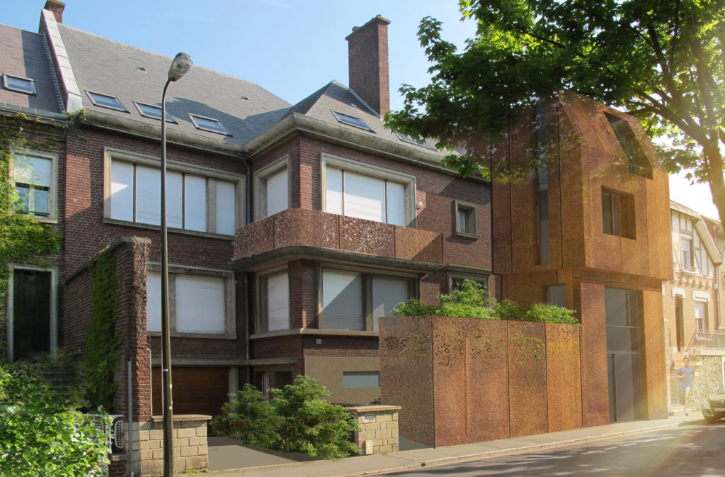 Фасады со стороны бульвара облицован corten сталью. Кортеновская сталь связывает новый образ здания с соседними кирпичными фасадами домов, а также благородно выделяет офис на их фоне.