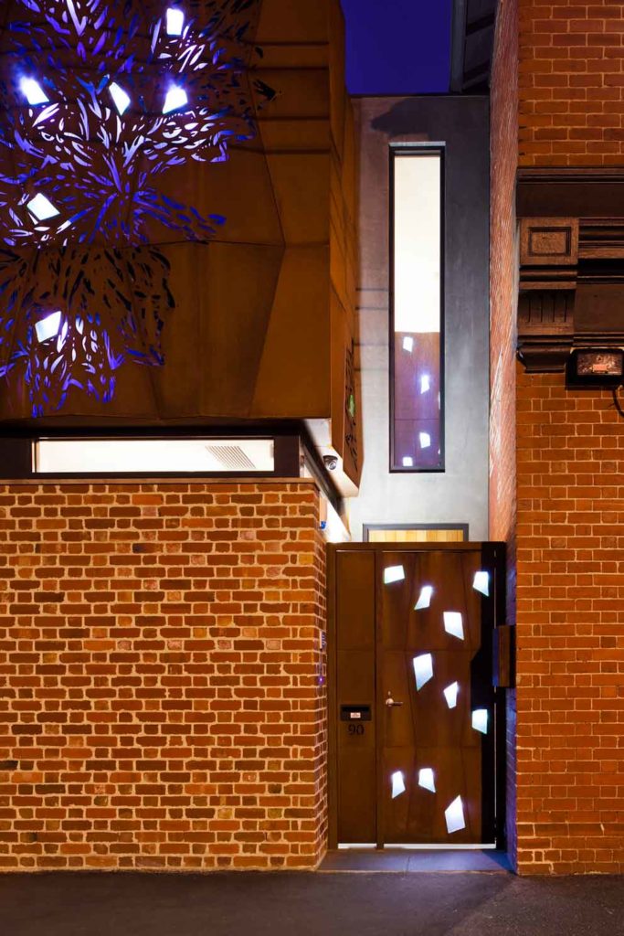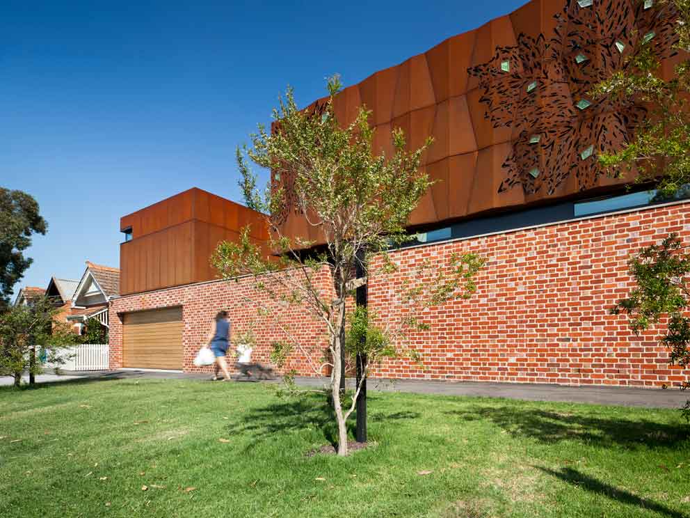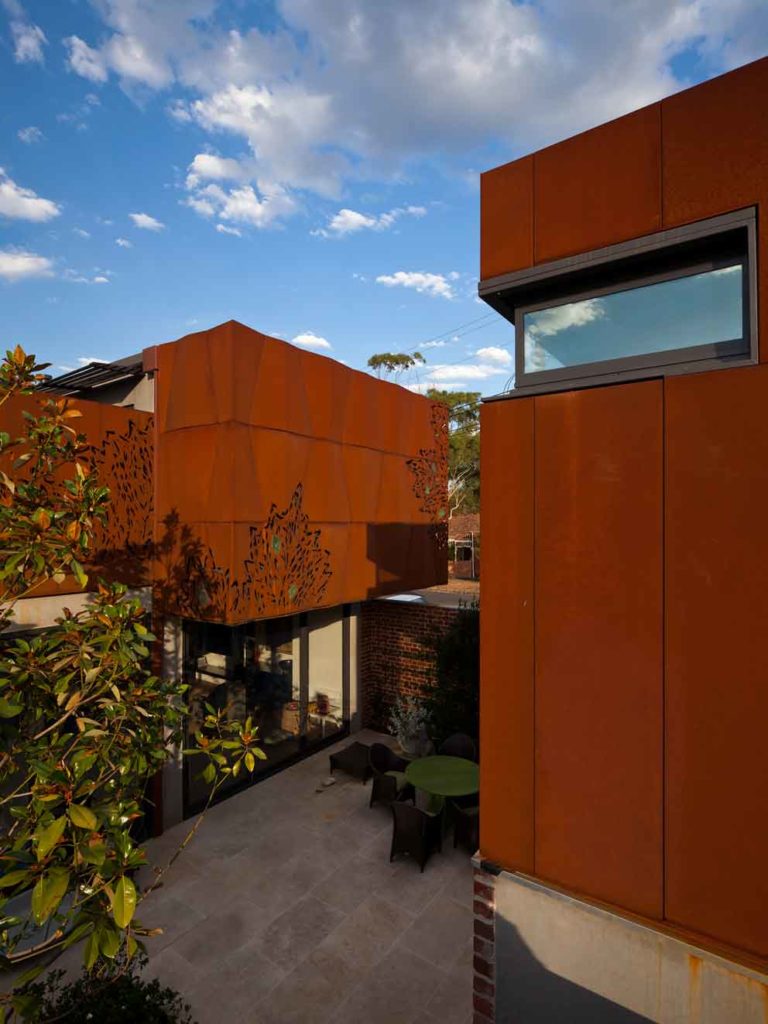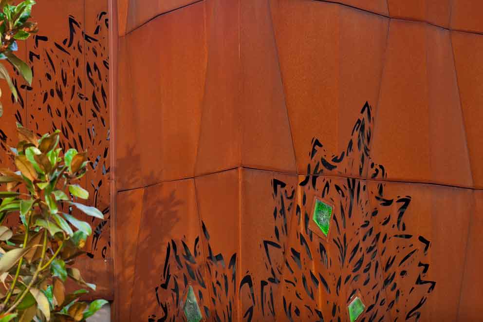 Кортеновская сталь в удивительных изогнутых формах украшает новый фасад дома. С помощью лазерной резки стали были созданы ажурные элементы фасады. Декоративный материал нашел свое применение и в интерьере. Согласитесь, перегородки из стали corten со стеклянными включениями смотриться крайне эффектно!