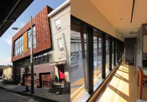 Верхние 2 этажа – жилое пространство для сотрудников компании. Кортеновская сталь – надежный, жесткий, невероятно стильный материал стал уместной облицовкой фасада верхних уровней.