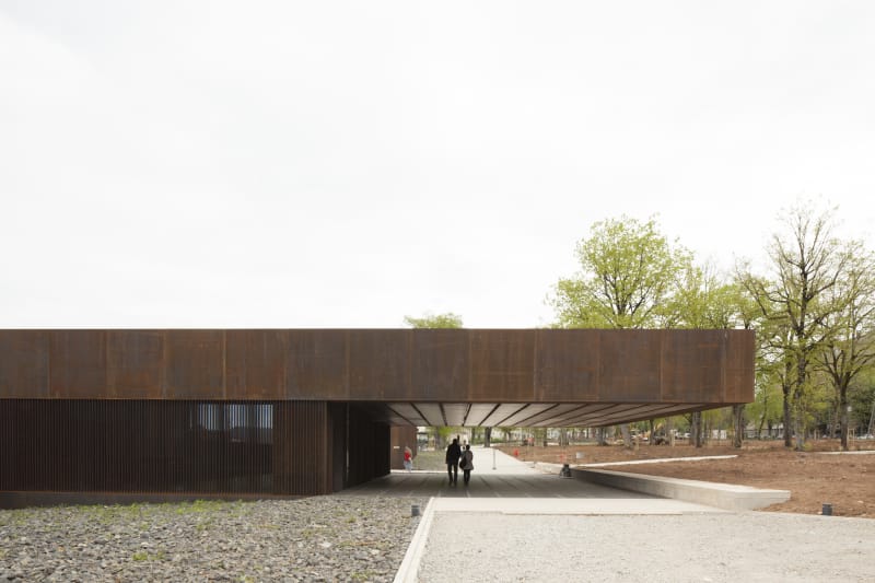 Облицовка выполнена из стали corten, также известной, как сталь «атмосферного воздействия». При влиянии погодных условий, т.е. коррозии, этот материал создает защитный слой ржавчины. Сталь кортен, взрослея со временем, идеально подошла к природной среде парка. Это не безжизненный или продезинфицированный продукт. Сталь живая и преобразуется с годами с позитивным развитием. Помимо этого цветовая гамма кортена повторяет розово-рыжие ноты Родеза. Оттенки этой уникальной стали также отражают работы французского художника абстракциониста Пьера Сулажа.
