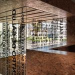 В некоторых местах стального фасада плоскость нарушает свое постоянство в виде углублений и фигурок, а надписи на стенах проводят параллель с наскальными письменами.