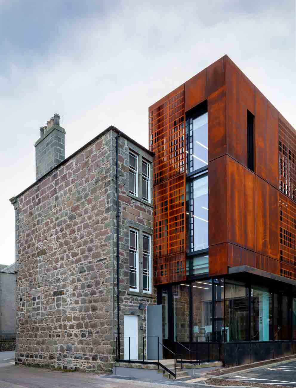 Для возведения пристройки, соединяющей переоборудованные и отреставрированные здания, компания Moxon Architects использовала сталь кортен. Перфорации, вырезанные в стальных листах, позволяют просматривать оригинальную кладку из песчаника, а стеклянный фасад раскрывает стену пристроенной конструкции.