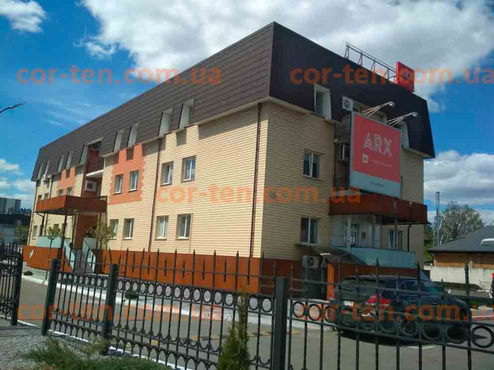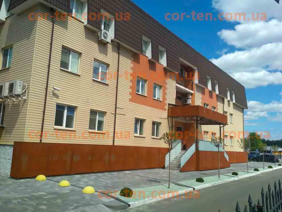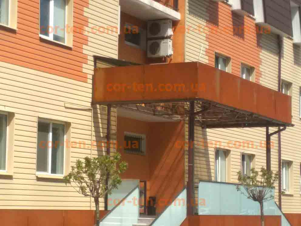 Произведена облицовка фриза и цоколя сталью corten 1,5 мм. Сталь не была подвержена химобработке - поржавела естественным путем по истечении 8 месяцев.